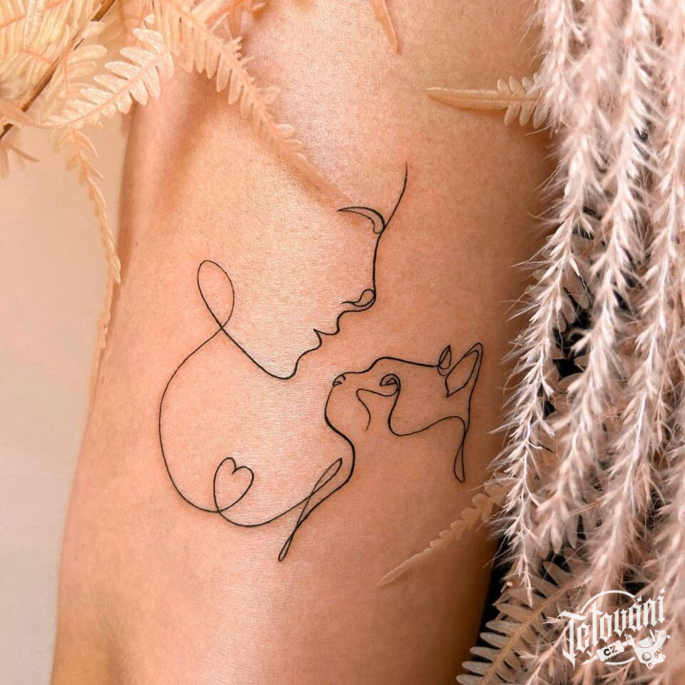 Tetování čáry jako žena s kočkou, symboly na stehno