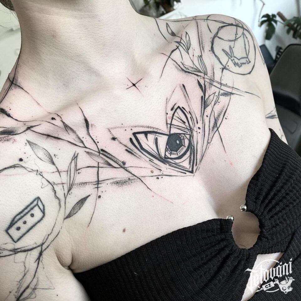 Tetování čáry, srdce s okem na hrudi