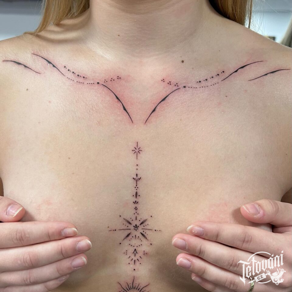 Tetování čáry, tečky, slunce ornamenty mezi prsa