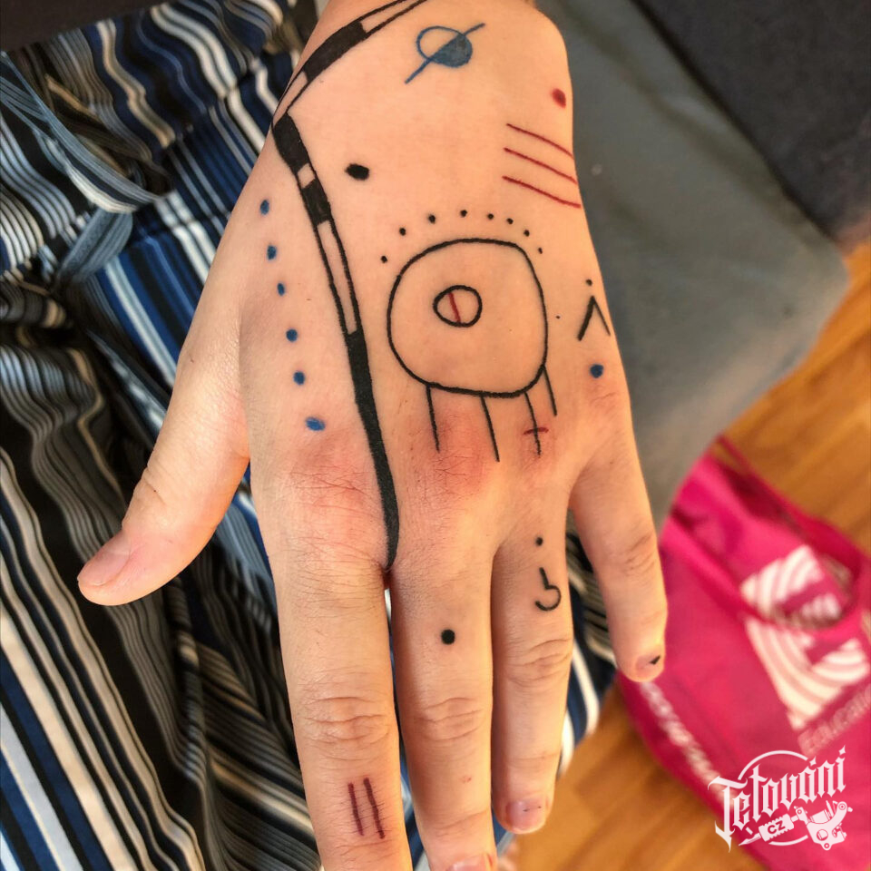 Tetování čáry, znaky a symboly na hřbetu ruky