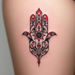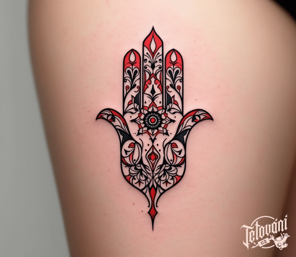 Tetování černo černá hamsa na stehně