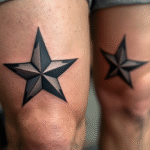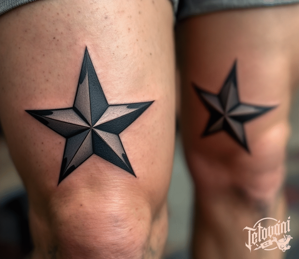 Tetování černo šedé hvězdy na kolenou