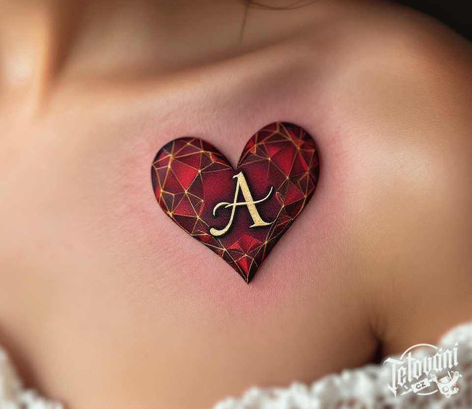 Tetování červené srdce a srdce s písmenem pod klíční kostí