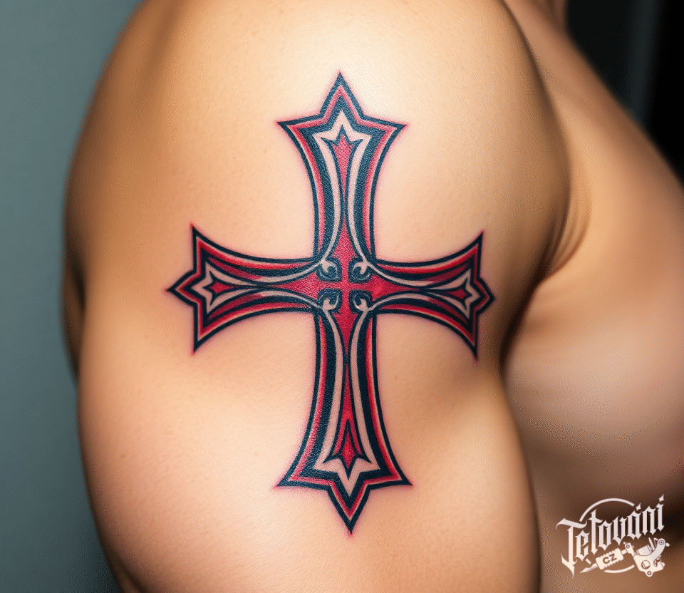 Tetování červený templářský kříž na rameno