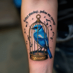 Tetování český citát a zvíře pták v kleci na předloktí