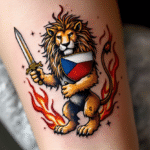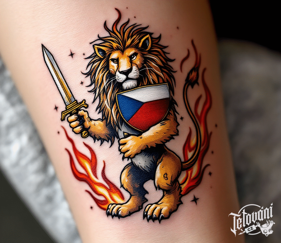 Tetování český lev s českou vlajkou a mečem na předloktí