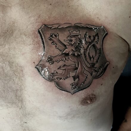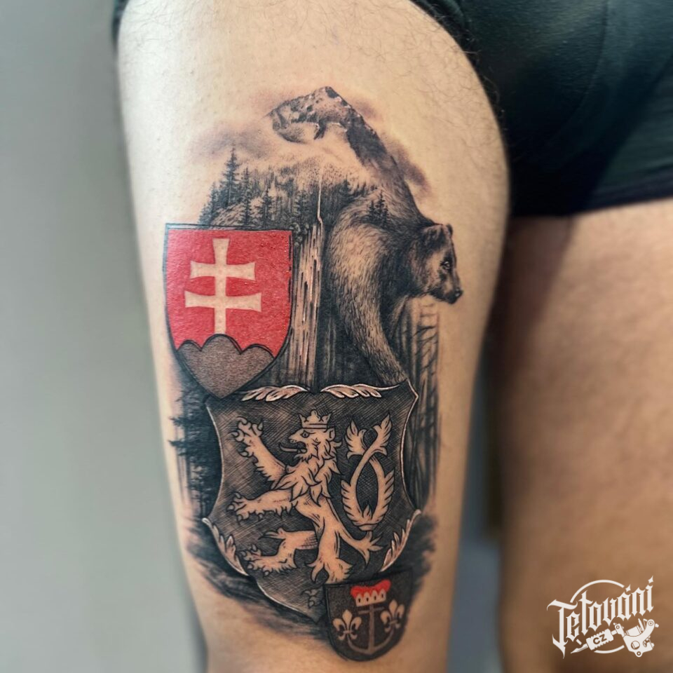 Tetování český lev, slovenský znak na stehně