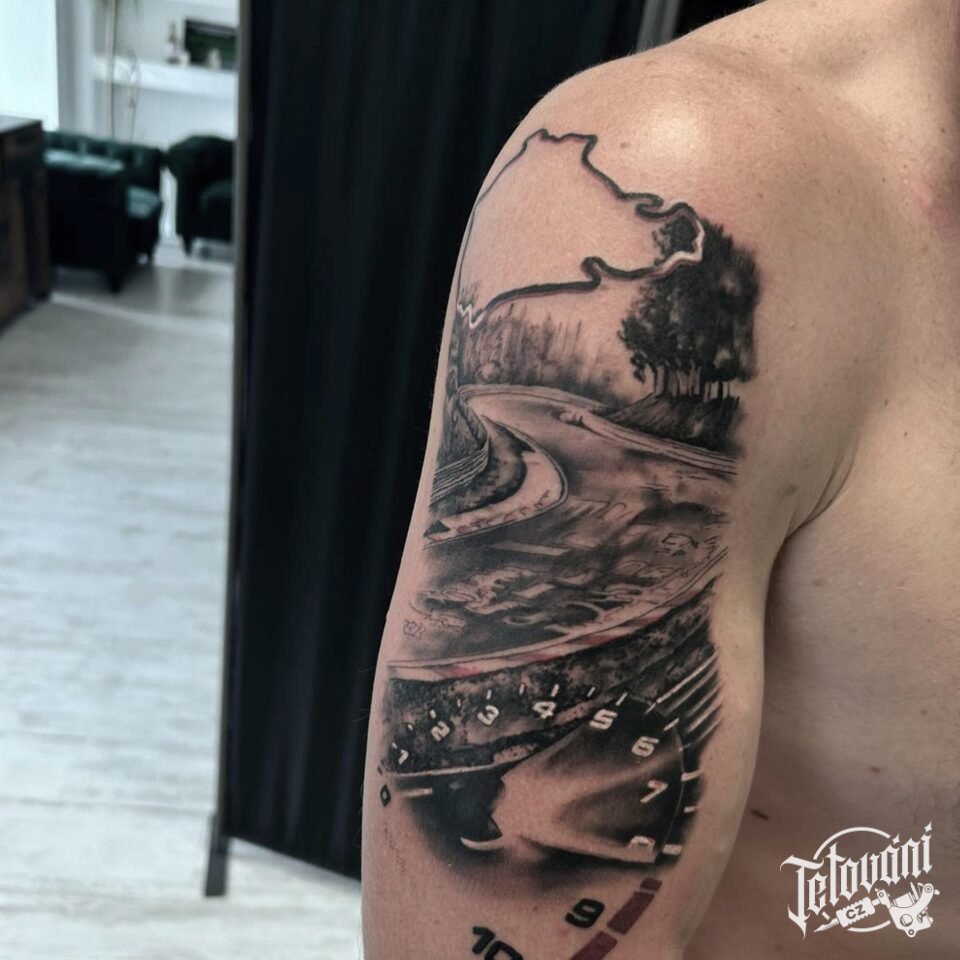 Tetování cesta, auto, znaky a symboly, tachometr na rameni