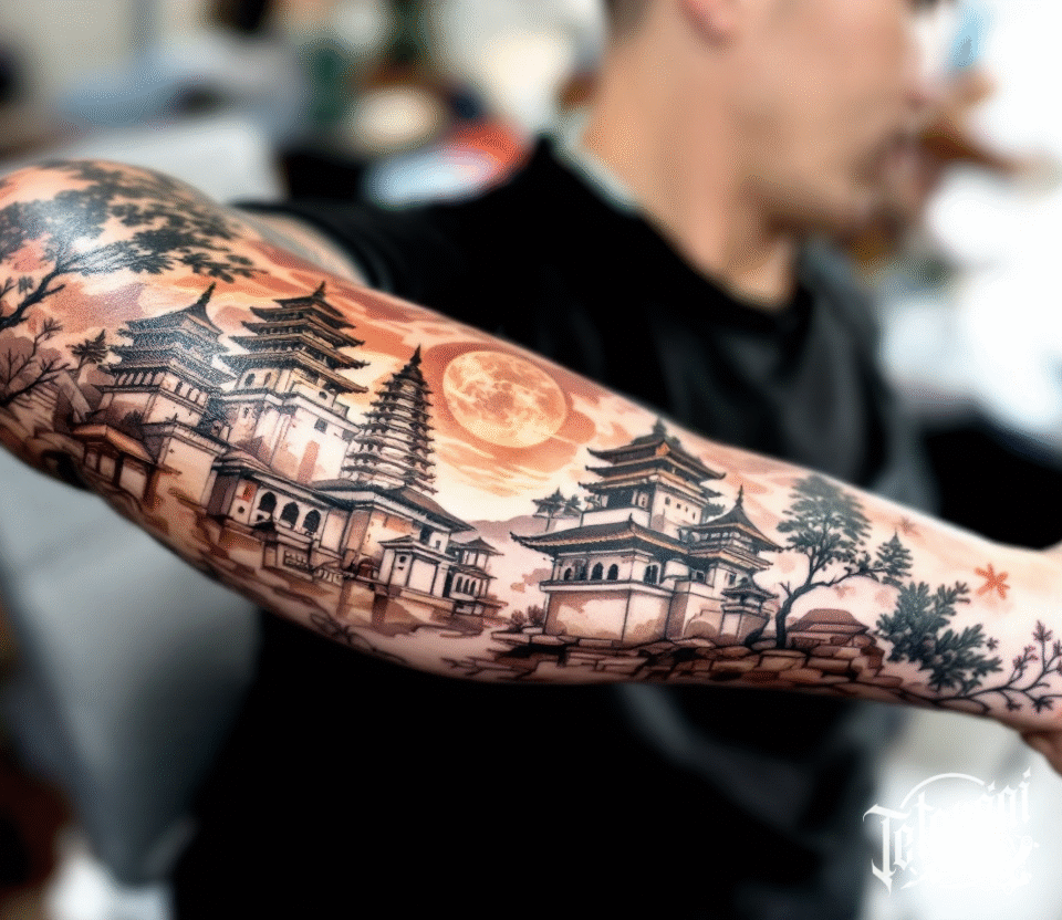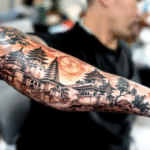 Tetování cestování, buddhistické znaky a symboly na předloktí