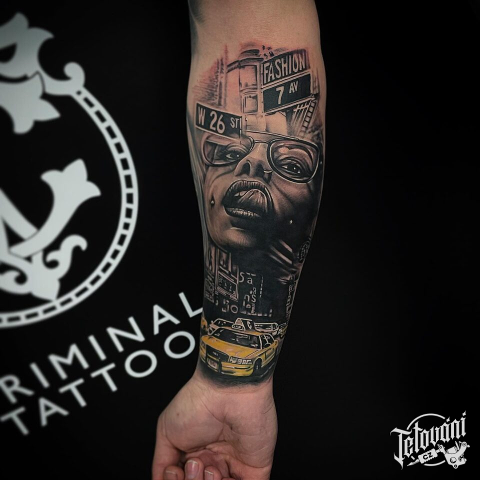 Tetování cestování, dopravní prostředky, auta, portrét na předloktí
