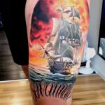 Tetování cestování, dopravní prostředky, příroda, loď na moři na stehně