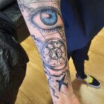 Tetování cestování, kompas, dopravní prostředky, letadlo a oko na předloktí