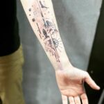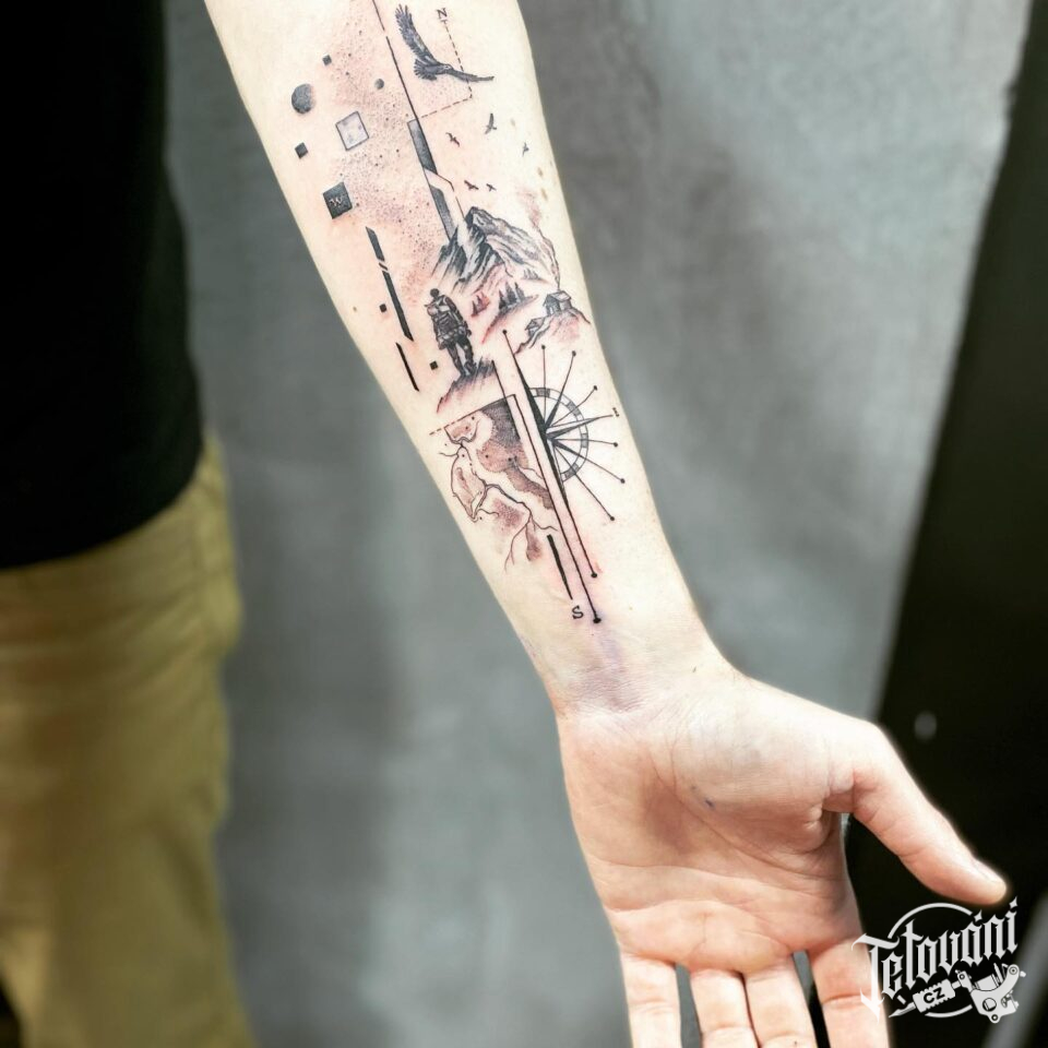 Tetování cestování, kompas, příroda, hory, pták a tvary na předloktí