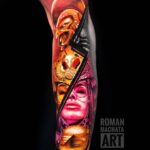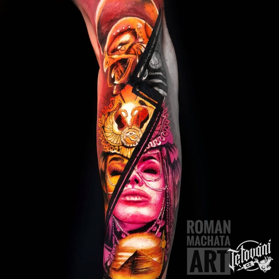 Tetování cestování, mýtické bytosti, Anubis, egyptské oko, žena a zvířata, pták na rukávu