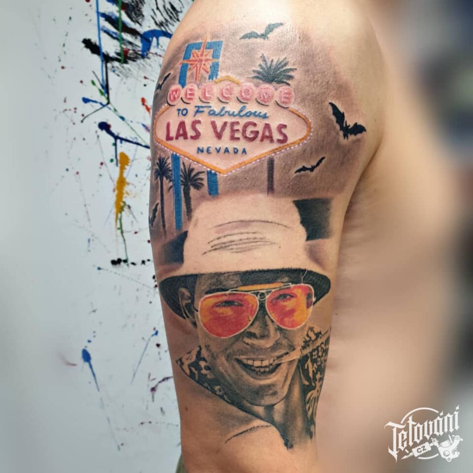 Tetování cestování, nápis, portrét na rameni
