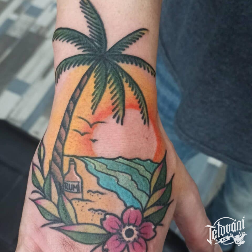 Tetování cestování, palma, moře a květina na hřbetu ruky