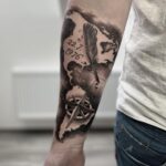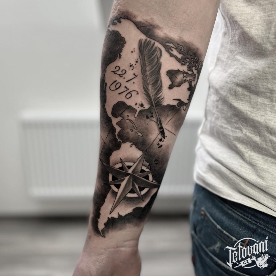 Tetování cestování, pírko, kompas, nápis datum na předloktí