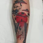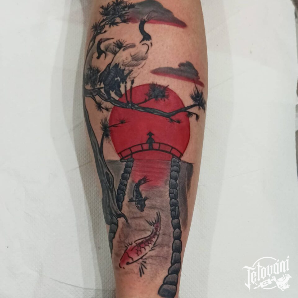 Tetování cestování, příroda, cesta, slunce, stromy a zvířata, ryba na lýtku