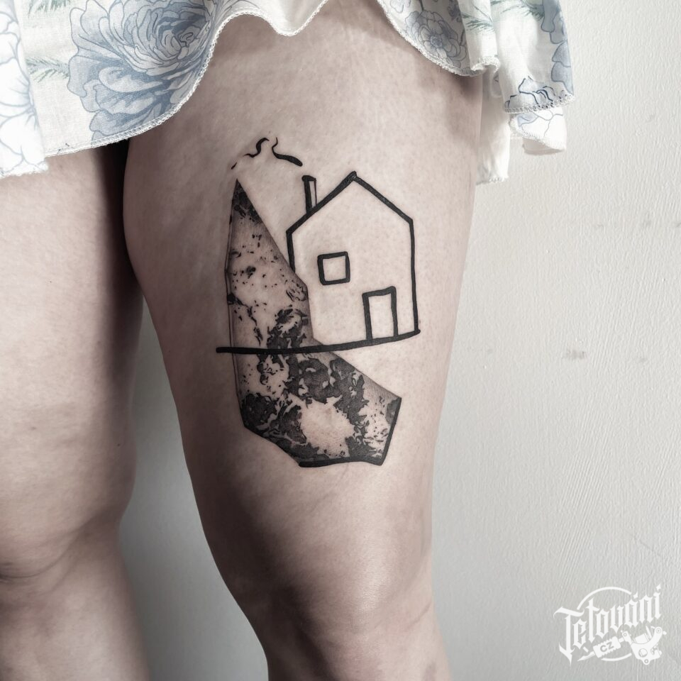 Tetování cestování, symbol rodiny, dům na stehně