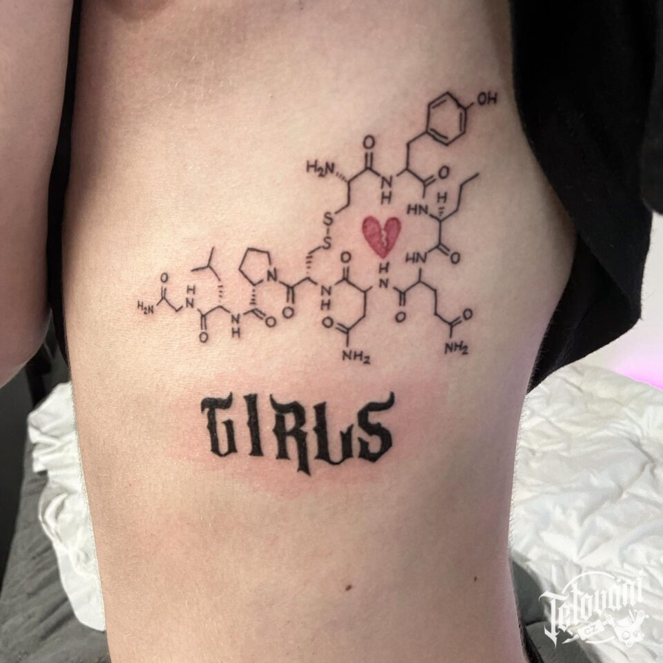 Tetování chemický vzorec a nápis na stehně