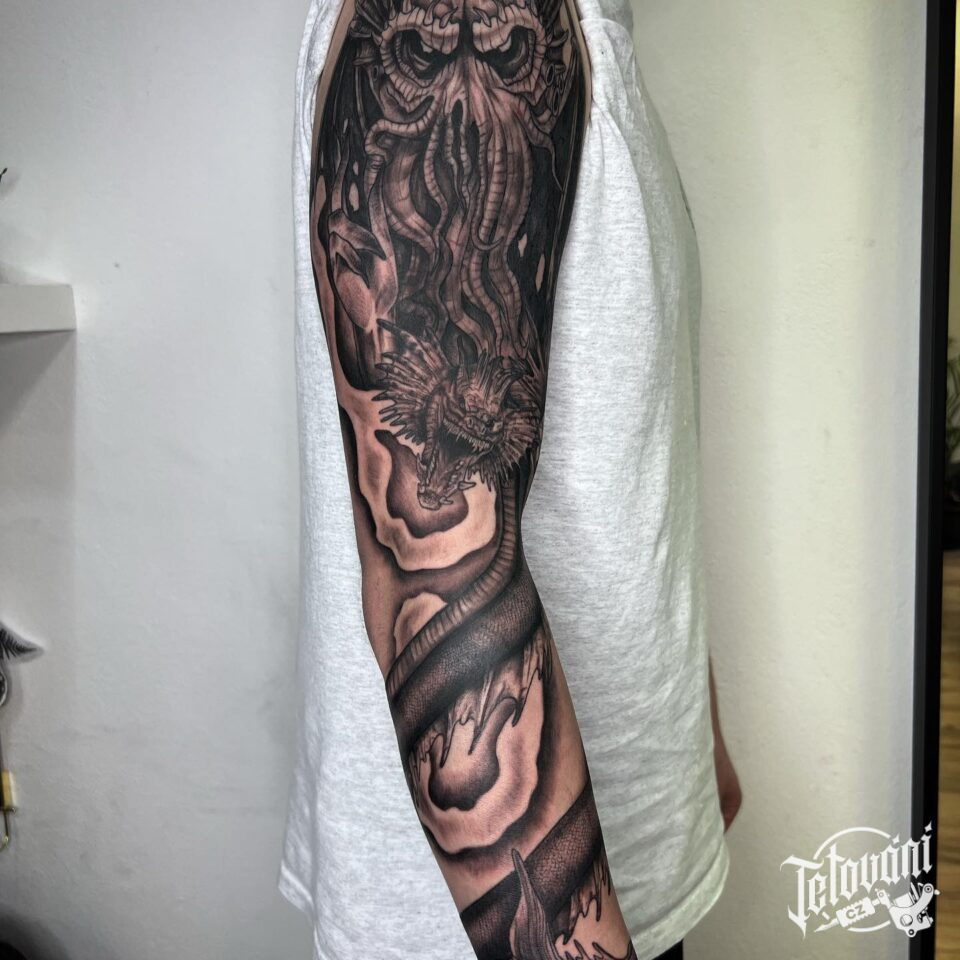 Tetování chobotnice, zvíře, mýtická bytost drak, rukáv
