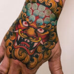 Tetování čínský znak a čínská mytologie, čínský lev, Foo dog na hřbet ruky