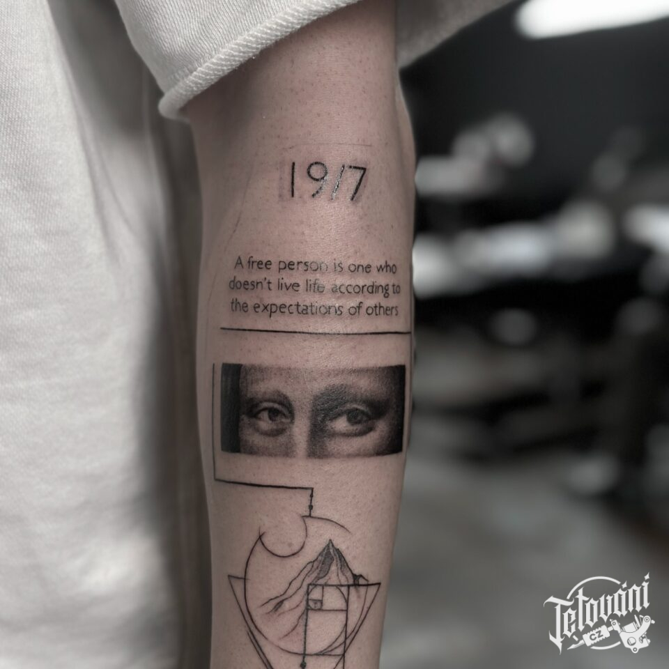 Tetování citát, tvary, osobnost, Mona Lisa na předloktí