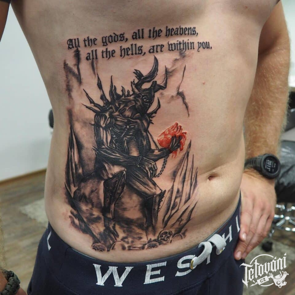 Tetování ďábel a nápisy, citát na břicho