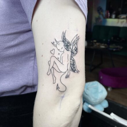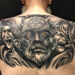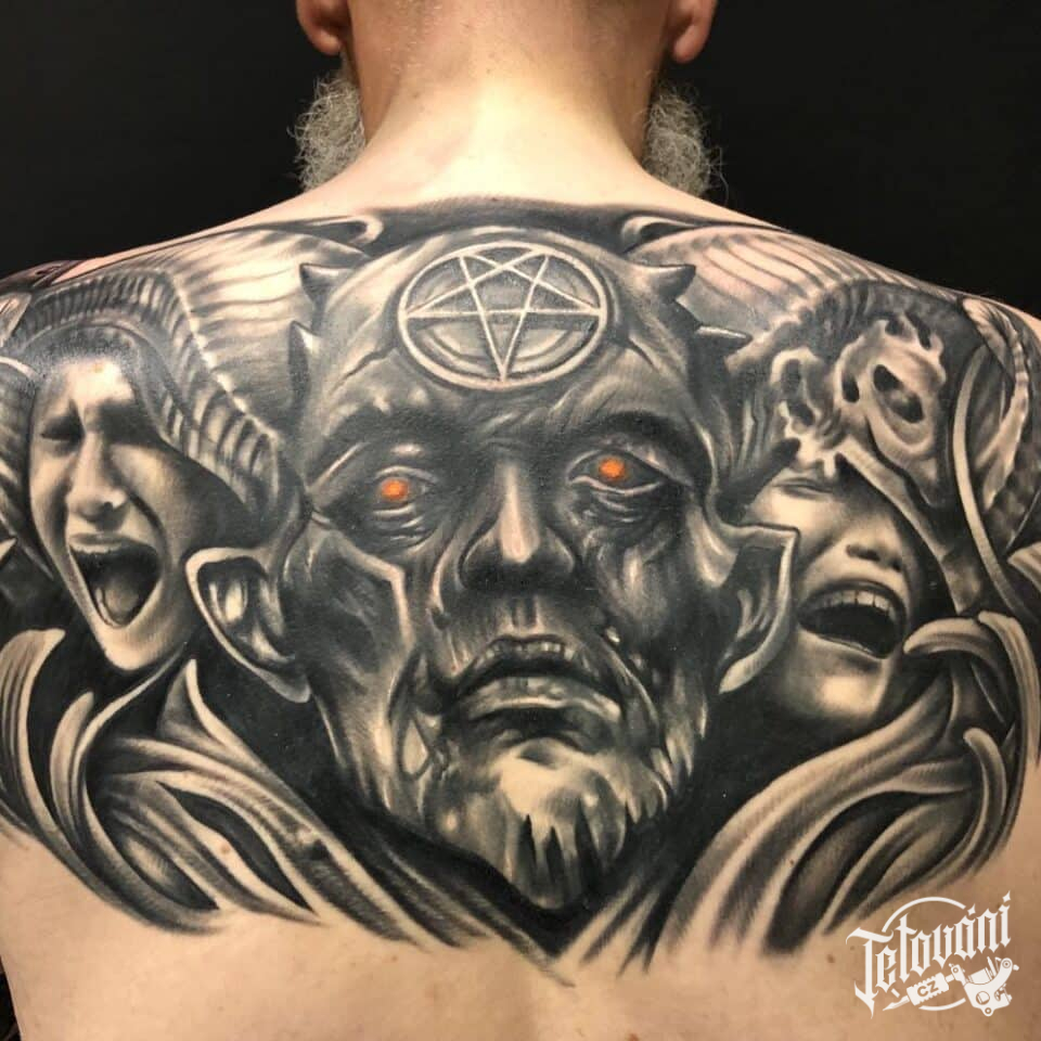 Tetování ďábel, ženy, smutek, znaky a symboly pěticípá hvězda na lopatky