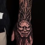 Tetování ďábelská maska Hannya na hřbetu ruky