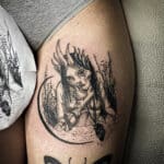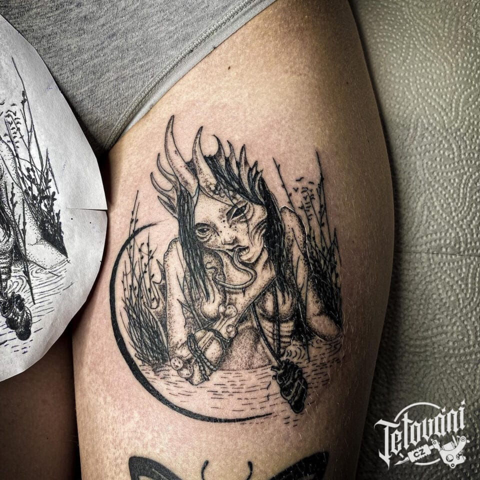 Tetování ďáblice na stehně