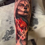 Tetování ďáblice svírající srdce v rukou na předloktí