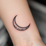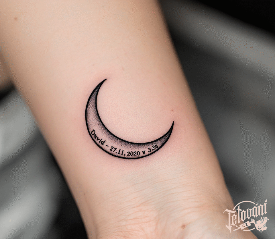 Tetování datum a čas narození dítěte se jménem v měsíci na předloktí