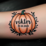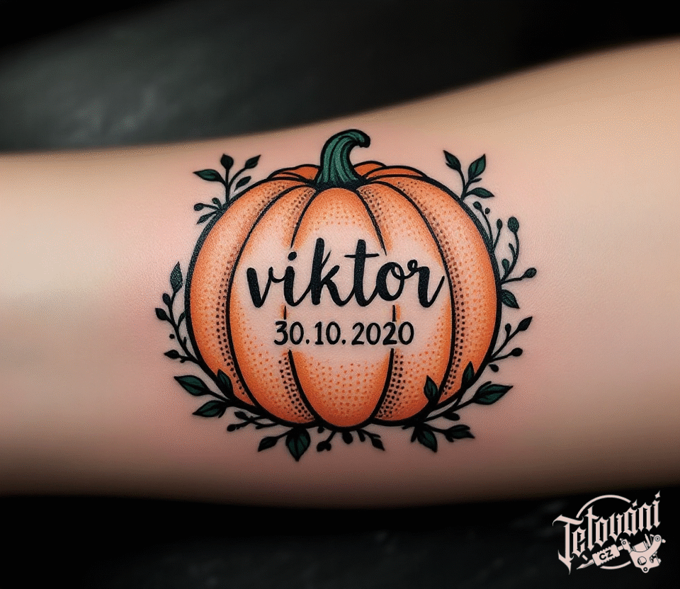 Tetování datum a jméno narození dítěte, nápis s dýní na předloktí