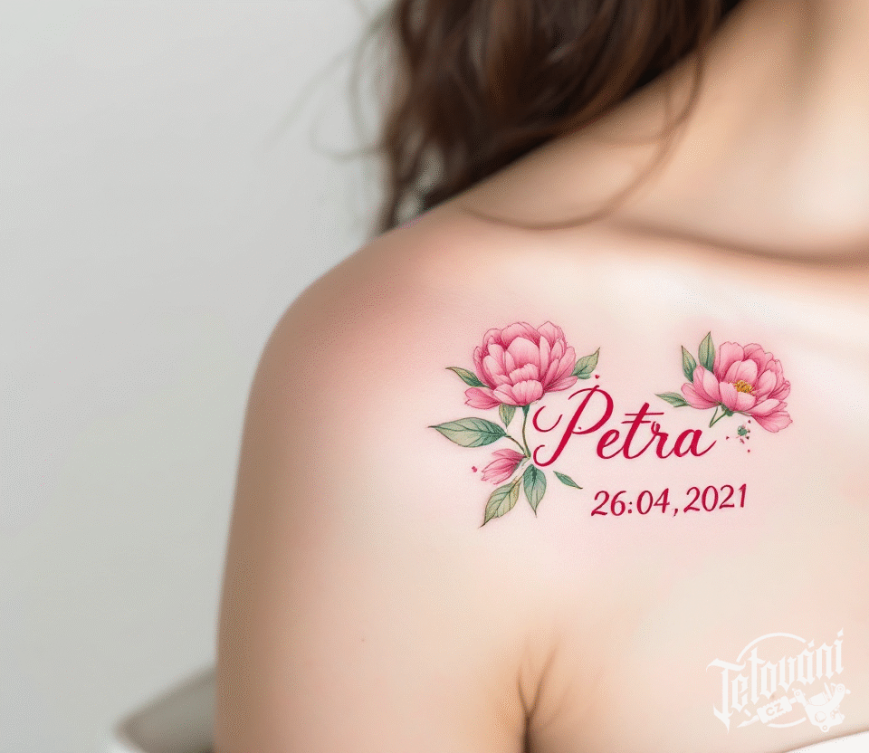 Tetování datum a jméno narození dítěte s pivoňkami pod klíční kostí
