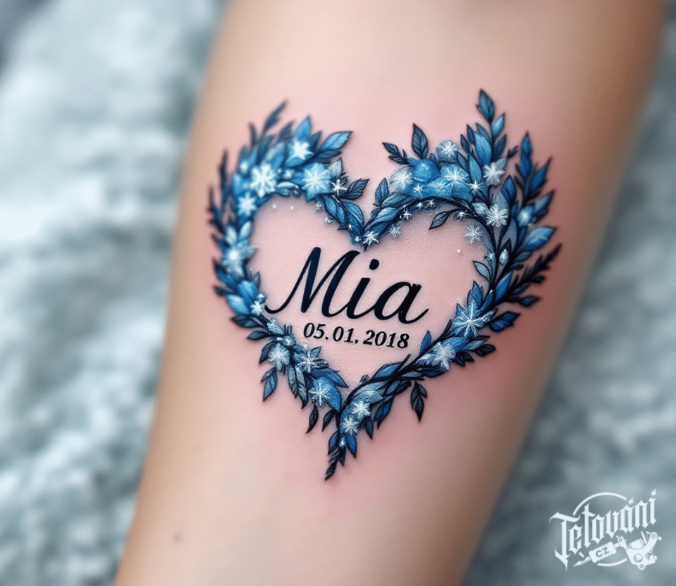 Tetování datum narození dětí, nápis, jméno dítěte v srdci na předloktí