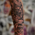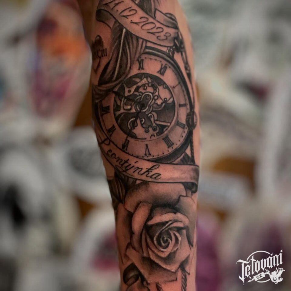 Tetování datum narození dítěte a hodiny a růže na předloktí