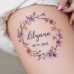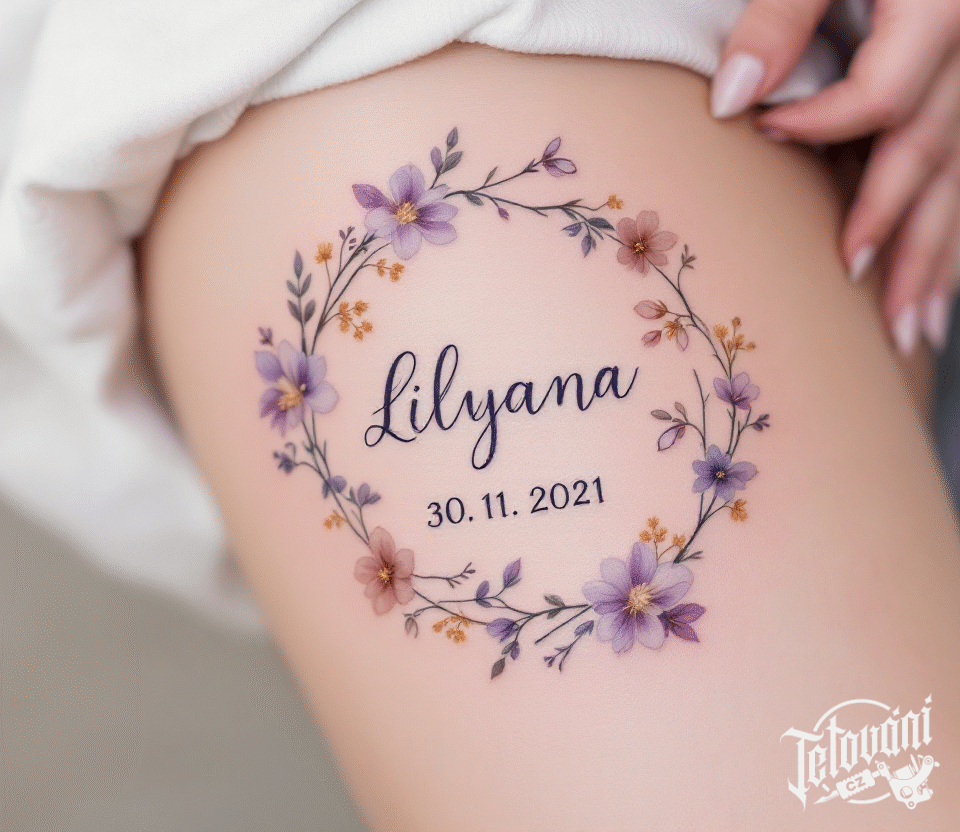 Tetování datum narození dítěte, jméno s věnečkem na boku stehna