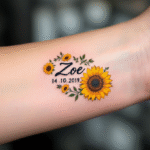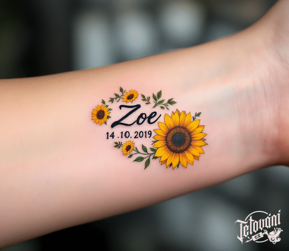 Tetování datum narození dítěte, jméno Zoe se slunečnicí na předloktí