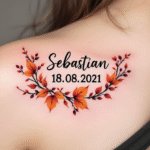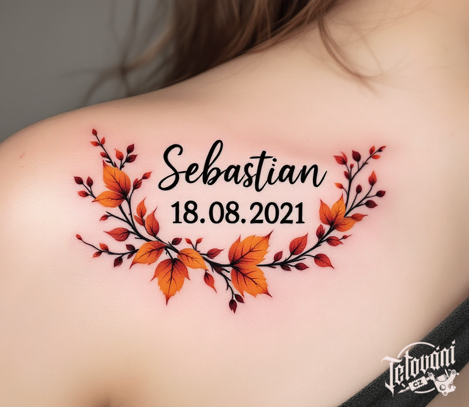 Tetování datum narození dítěte, nápisy, jméno Sebastian na lopatce