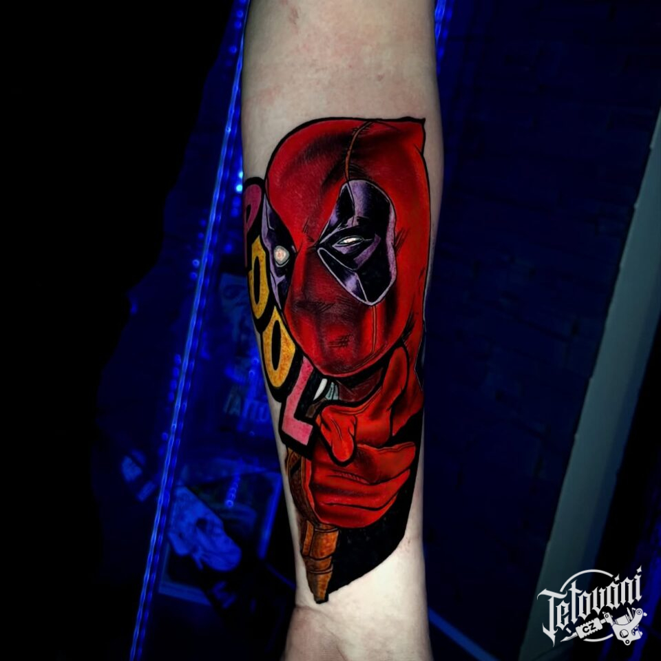 Tetování Deadpool z filmů a pohádek komiks, Marvel na předloktí