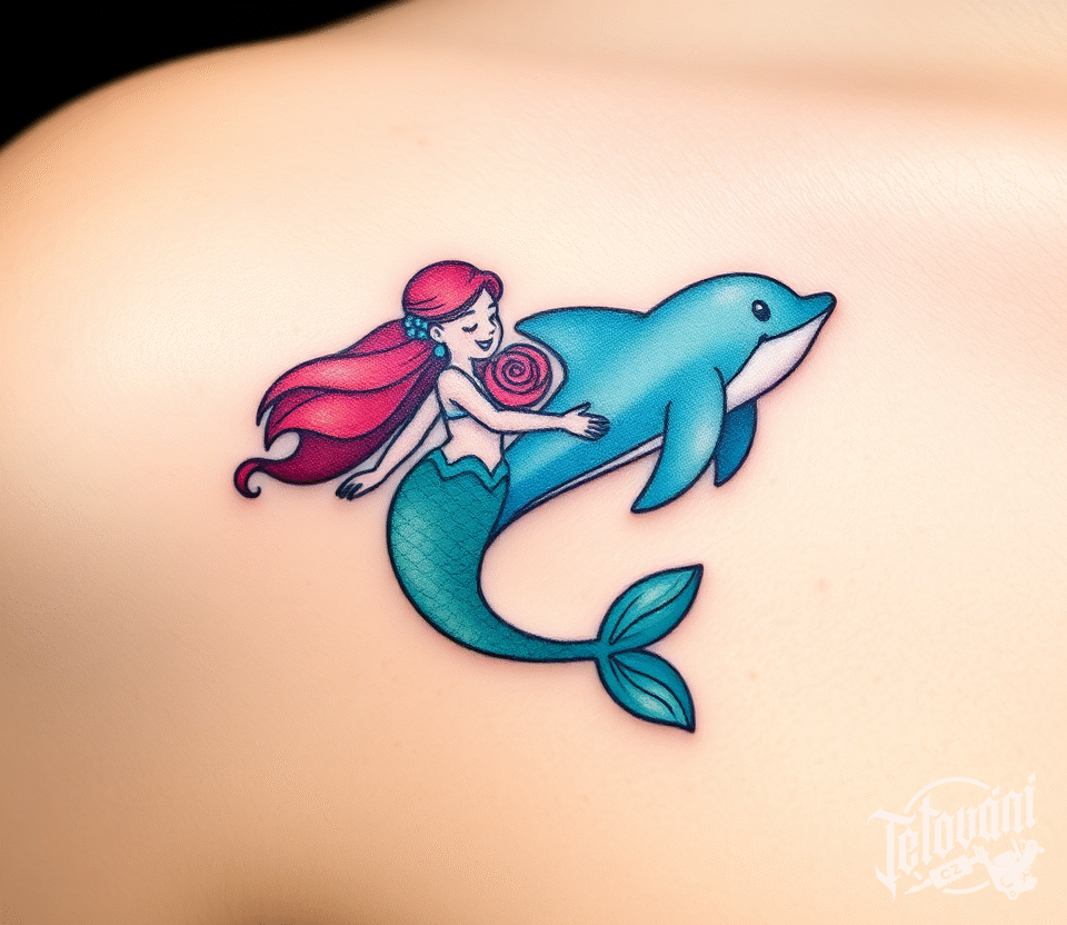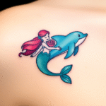 Tetování delfín s mořskou pannou pod klíční kostí