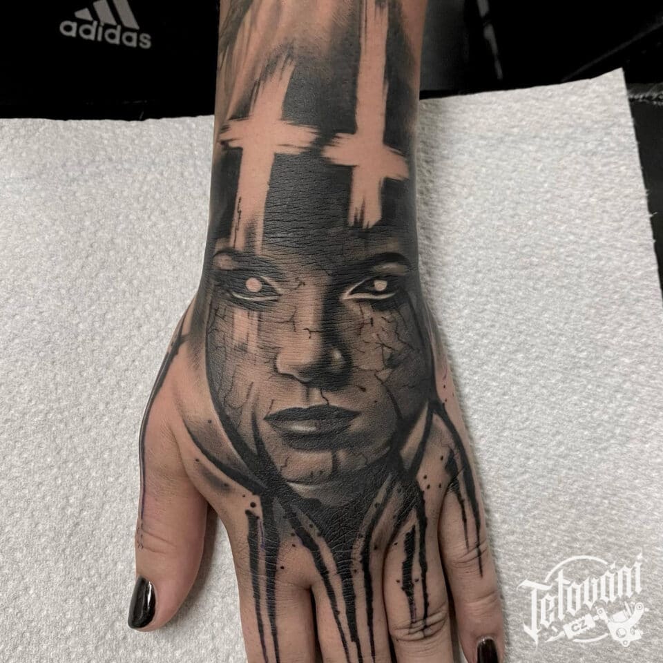 Tetování démon, ďábel, portrét na hřbetu ruky