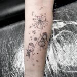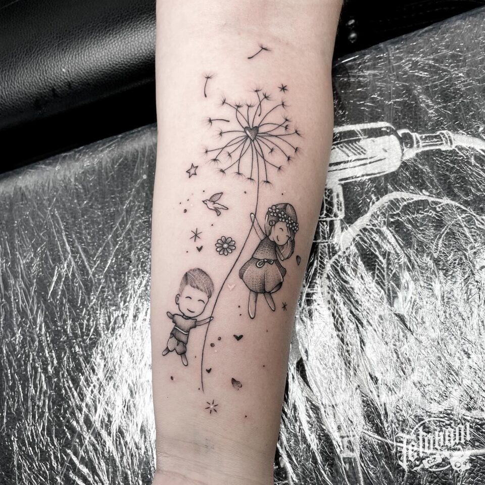 Tetování děti, postavičky, květiny pampelišky na předloktí