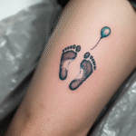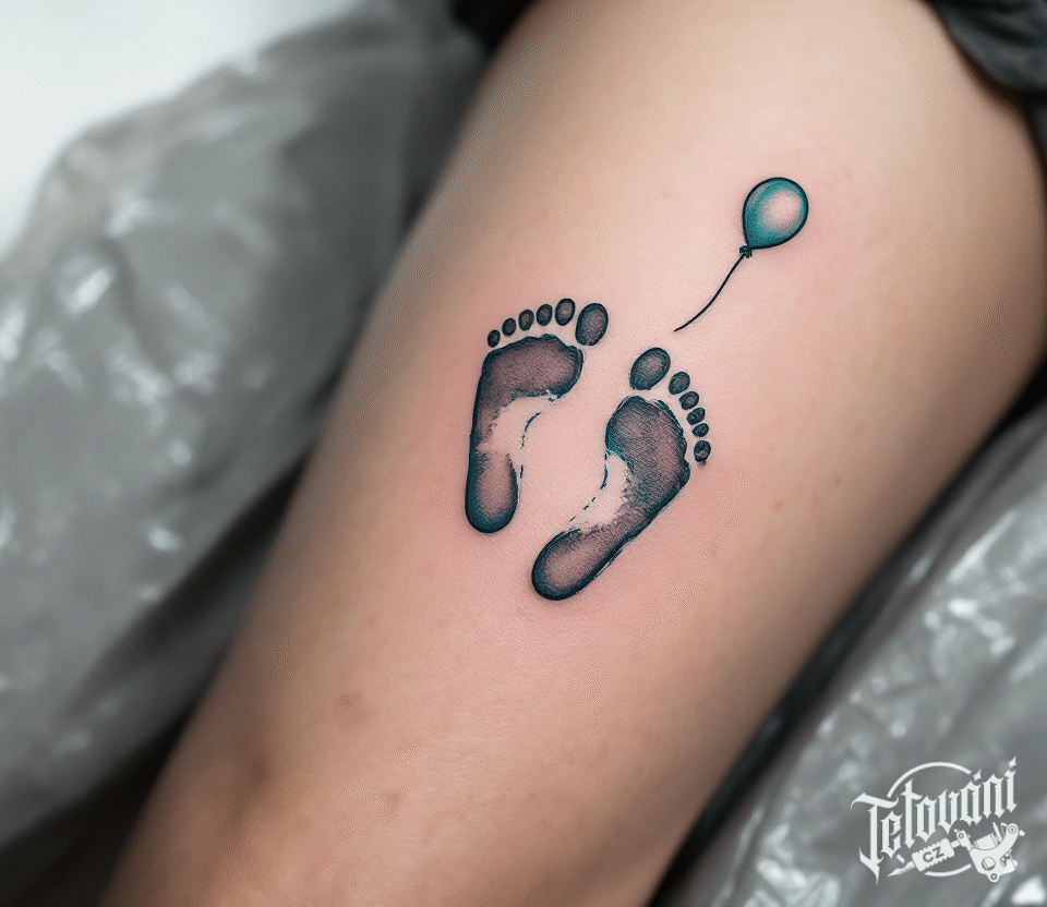 Tetování dětské nožičky a balónkem na stehně