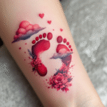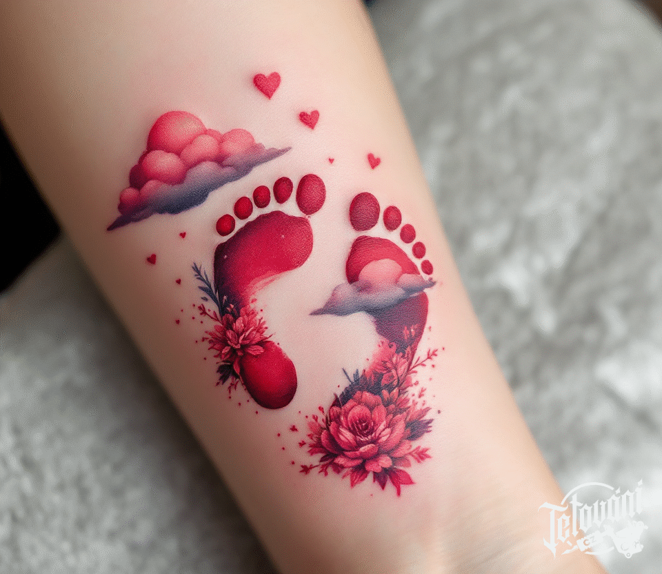 Tetování dětské nožičky s květinami, srdíčky a mráčkem na předloktí