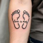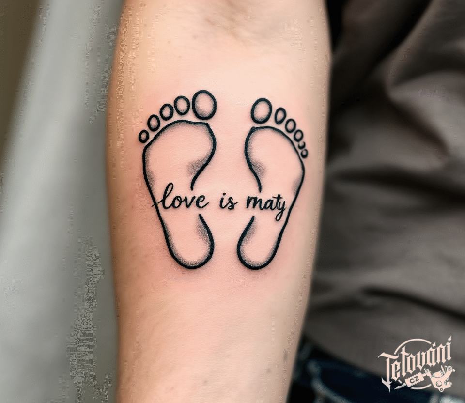 Tetování dětské nožičky s nápisem na předloktí