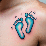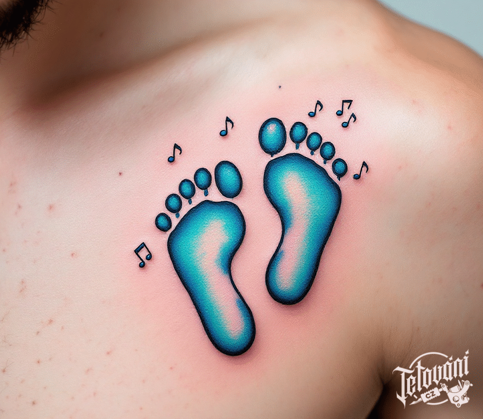 Tetování dětské nožičky s notami pod klíční kostí