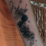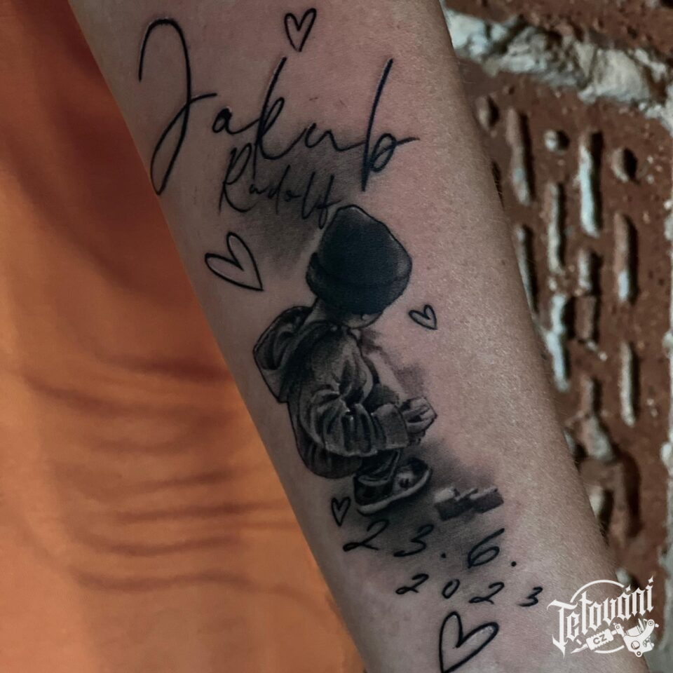 Tetování dítě, nápisy, jména a datumy narození dítěte na předloktí