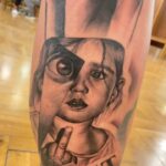 Tetování dítě s korunou, symbol, nápisy, písmena na holeň